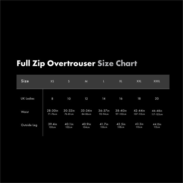 The Full Zip Overtrouser are Unisex sizing and have a tapered fit and elasticated waist.